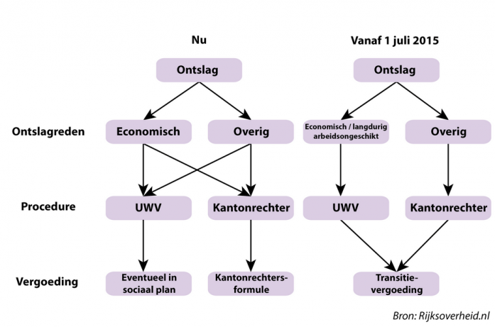 Vanaf 1 juli 2015 geldt voor de procedures via UWV en de kantonrechter een nieuw regiem. Bij beiden geldt dat er geen verschil meer is ten aanzien van de hoogte van de in principe door de werkgever aan werknemer te geven vergoeding ter compensatie van het ontslag. De bestaande kantonrechtersformule wordt buiten werking gesteld voor deze zaken.
